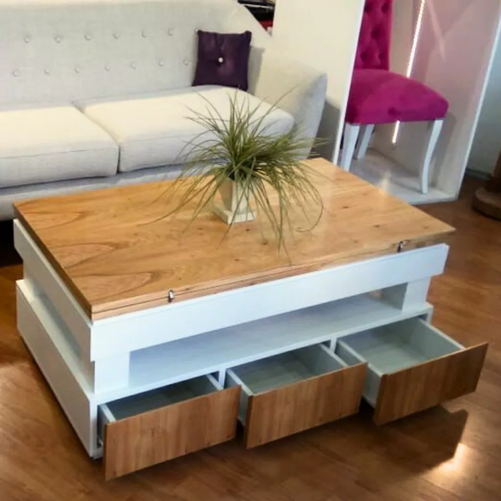 Con tapa simple o doble elevable, se adapta a tus necesidades al instante. Además, cuenta con tres cajones inferiores que ofrecen un práctico almacenamiento, manteniendo todo ordenado y accesible.